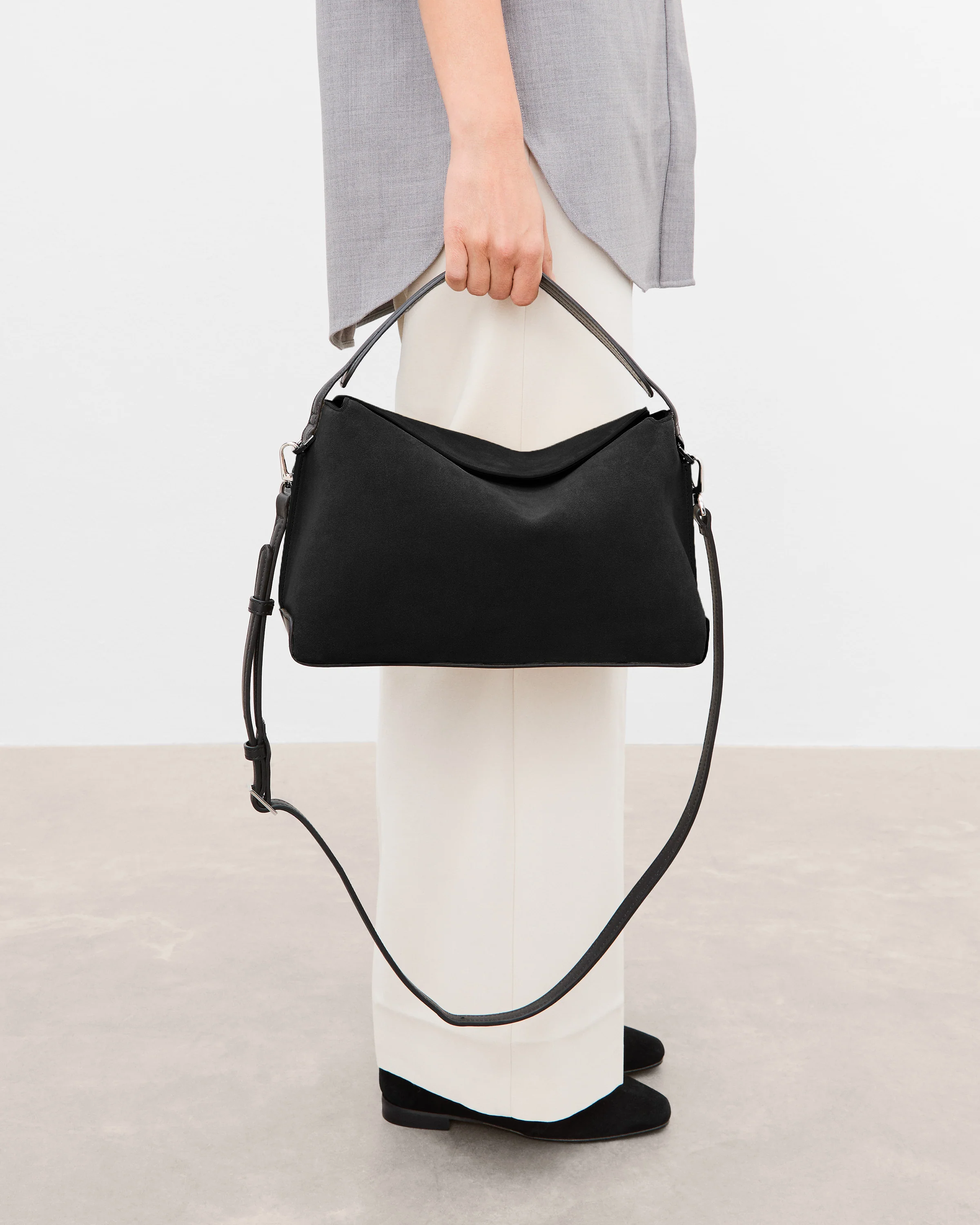 Introducing Helia, an update to the Hera bag. We have added a leather bottom plate to keep the construction in form and ensure that the bag is less sensitive when standing on the ground. The handle details are made of leather to create a nice contrast, mixing suede and leather. The size is still the same as the Hera bag.