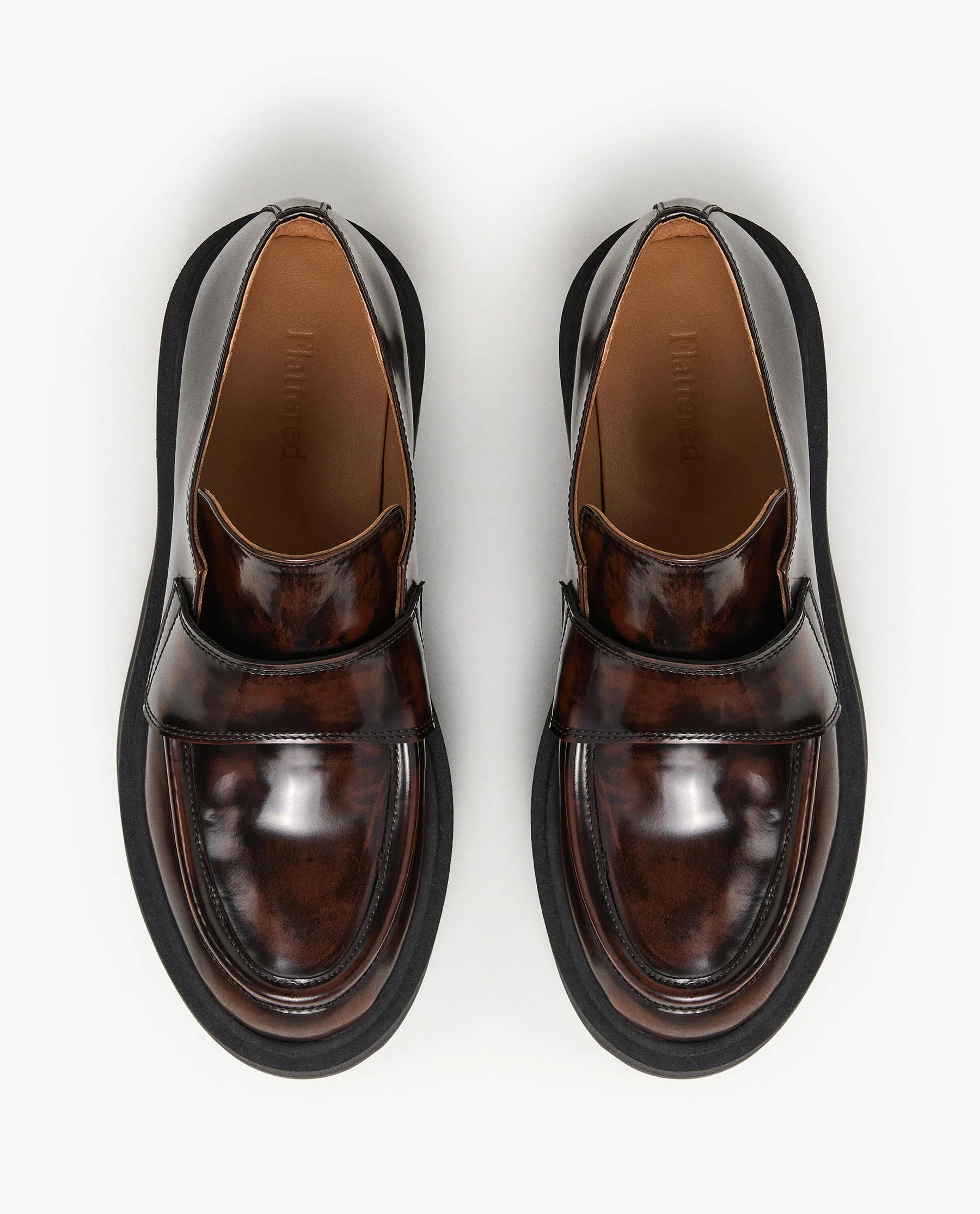 Leo is a loafer with a chunky, lugged sole, crafted from semi-shiny brush-off leather that exudes a subtle luster. Double row stitches along the edges lend a handcrafted, worked-through aesthetic. The footbed is cushioned, providing superior comfort and support for all-day wear. This loafer seamlessly combines a rugged, utilitarian sole with a refined leather upper, creating a unique and fashion-forward look.